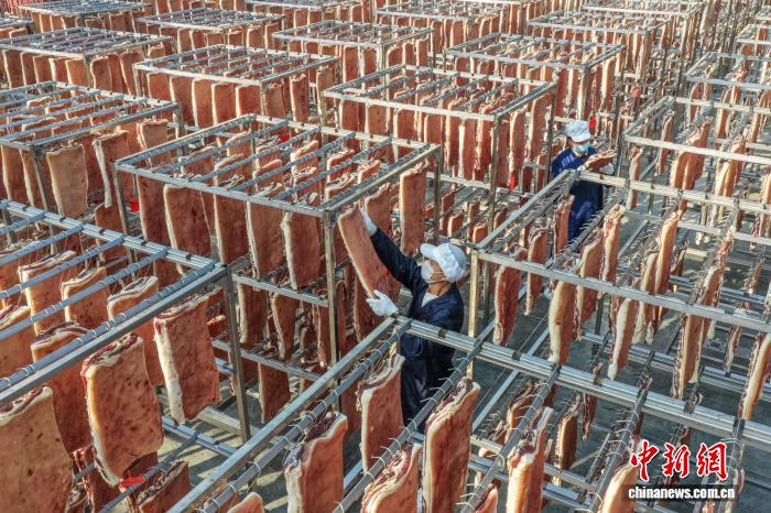眼停恰是古板腊味添工的季候。12月9日,正在安徽省黄山市黄山区齐江死态农业科技无限公司的晒场上,任务职员乘阴佳天色将腊肉、香肠等产物停止晾晒。施亚磊 摄